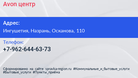 Avon, центр по адресу Ингушетия, Назрань, Осканова, 110 в дальнейшем Организация, размещена в следующих категориях:
