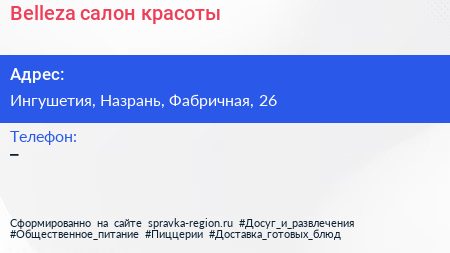 Belleza, салон красоты по адресу Ингушетия, Назрань, Фабричная, 26 в дальнейшем Организация, размещена в следующих категориях: