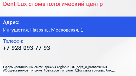 Dent Lux, стоматологический центр по адресу Ингушетия, Назрань, Московская, 1 в дальнейшем Организация, размещена в следующих категориях: