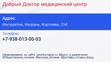 Добрый Доктор, медицинский центр по адресу Ингушетия, Назрань, Картоева, 154 в дальнейшем Организация, размещена в следующих категориях: