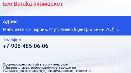 Eco Baraka, экомаркет по адресу Ингушетия, Назрань, Муталиева (Центральный АО), 5 в дальнейшем Организация, размещена в следующих категориях: