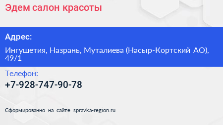 Эдем, салон красоты по адресу Ингушетия, Назрань, Муталиева (Насыр-Кортский АО), 49/1 в дальнейшем Организация, размещена в следующих категориях: