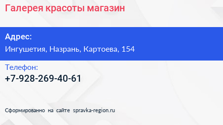 Галерея красоты, магазин по адресу Ингушетия, Назрань, Картоева, 154 в дальнейшем Организация, размещена в следующих категориях: