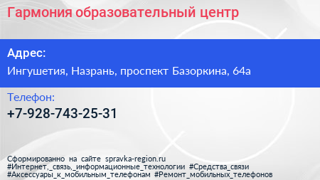 Гармония, образовательный центр по адресу Ингушетия, Назрань, проспект Базоркина, 64а в дальнейшем Организация, размещена в следующих категориях: