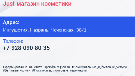 Just, магазин косметики по адресу Ингушетия, Назрань, Чеченская, 38/1 в дальнейшем Организация, размещена в следующих категориях: