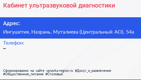 Кабинет ультразвуковой диагностики по адресу Ингушетия, Назрань, Муталиева (Центральный АО), 54а в дальнейшем Организация, размещена в следующих категориях: