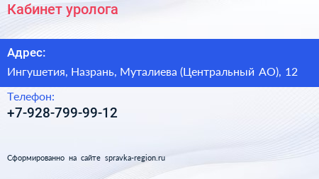 Кабинет уролога по адресу Ингушетия, Назрань, Муталиева (Центральный АО), 12 в дальнейшем Организация, размещена в следующих категориях: