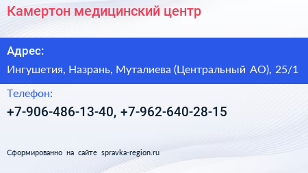 Камертон, медицинский центр по адресу Ингушетия, Назрань, Муталиева (Центральный АО), 25/1 в дальнейшем Организация, размещена в следующих категориях: