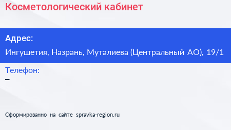 Косметологический кабинет по адресу Ингушетия, Назрань, Муталиева (Центральный АО), 19/1 в дальнейшем Организация, размещена в следующих категориях: