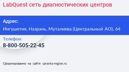 LabQuest, сеть диагностических центров по адресу Ингушетия, Назрань, Муталиева (Центральный АО), 64 в дальнейшем Организация, размещена в следующих категориях: