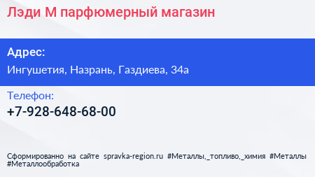 Лэди М, парфюмерный магазин по адресу Ингушетия, Назрань, Газдиева, 34а в дальнейшем Организация, размещена в следующих категориях: