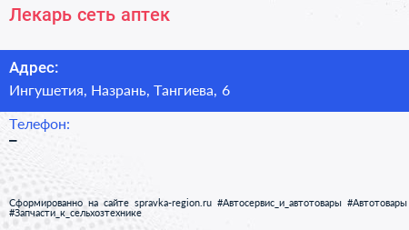 Лекарь, сеть аптек по адресу Ингушетия, Назрань, Тангиева, 6 в дальнейшем Организация, размещена в следующих категориях: