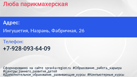 Люба, парикмахерская по адресу Ингушетия, Назрань, Фабричная, 26 в дальнейшем Организация, размещена в следующих категориях:
