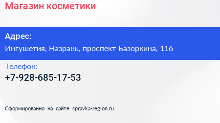 Магазин косметики по адресу Ингушетия, Назрань, проспект Базоркина, 116 в дальнейшем Организация, размещена в следующих категориях: