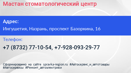 Мастан, стоматологический центр по адресу Ингушетия, Назрань, проспект Базоркина, 16 в дальнейшем Организация, размещена в следующих категориях: