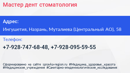 Мастер-дент, стоматология по адресу Ингушетия, Назрань, Муталиева (Центральный АО), 58 в дальнейшем Организация, размещена в следующих категориях: