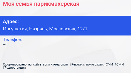 Моя семья, парикмахерская по адресу Ингушетия, Назрань, Московская, 12/1 в дальнейшем Организация, размещена в следующих категориях: