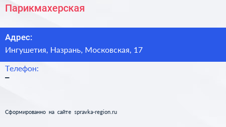 Парикмахерская по адресу Ингушетия, Назрань, Московская, 17 в дальнейшем Организация, размещена в следующих категориях: