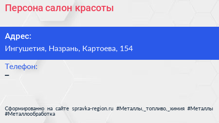 Персона, салон красоты по адресу Ингушетия, Назрань, Картоева, 154 в дальнейшем Организация, размещена в следующих категориях: