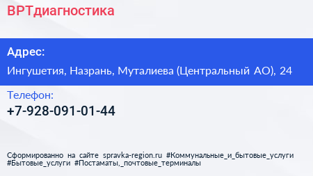 ВРТдиагностика по адресу Ингушетия, Назрань, Муталиева (Центральный АО), 24 в дальнейшем Организация, размещена в следующих категориях: