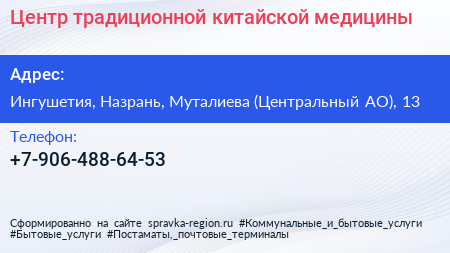 Центр традиционной китайской медицины по адресу Ингушетия, Назрань, Муталиева (Центральный АО), 13 в дальнейшем Организация, размещена в следующих категориях: