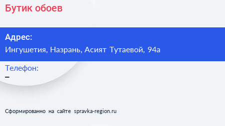 Бутик обоев по адресу Ингушетия, Назрань, Асият Тутаевой, 94а в дальнейшем Организация, размещена в следующих категориях: