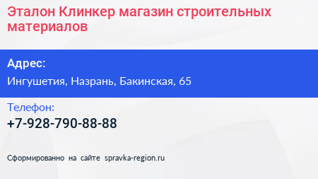 Эталон Клинкер, магазин строительных материалов по адресу Ингушетия, Назрань, Бакинская, 65 в дальнейшем Организация, размещена в следующих категориях: