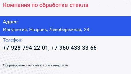Компания по обработке стекла по адресу Ингушетия, Назрань, Левобережная, 28 в дальнейшем Организация, размещена в следующих категориях: