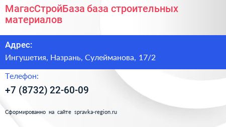 МагасСтройБаза, база строительных материалов по адресу Ингушетия, Назрань, Сулейманова, 17/2 в дальнейшем Организация, размещена в следующих категориях: