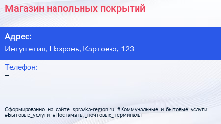 Магазин напольных покрытий по адресу Ингушетия, Назрань, Картоева, 123 в дальнейшем Организация, размещена в следующих категориях: