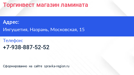 Торгинвест, магазин ламината по адресу Ингушетия, Назрань, Московская, 15 в дальнейшем Организация, размещена в следующих категориях: