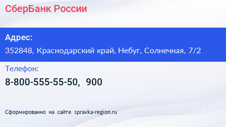 СберБанк России по адресу 352848, Краснодарский край, Небуг, Солнечная, 7/2 в дальнейшем Организация, размещена в следующих категориях: