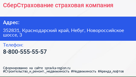 СберСтрахование, страховая компания по адресу 352831, Краснодарский край, Небуг, Новороссийское шоссе, 3 в дальнейшем Организация, размещена в следующих категориях: