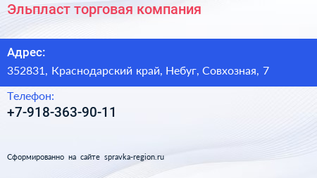 Эльпласт, торговая компания по адресу 352831, Краснодарский край, Небуг, Совхозная, 7 в дальнейшем Организация, размещена в следующих категориях: