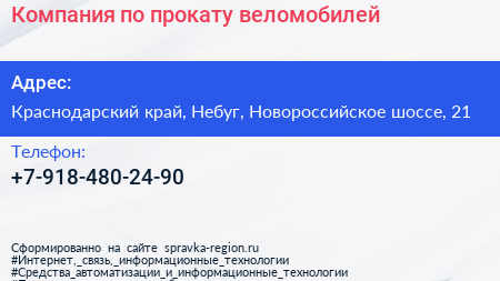 Компания по прокату веломобилей по адресу Краснодарский край, Небуг, Новороссийское шоссе, 21 в дальнейшем Организация, размещена в следующих категориях: