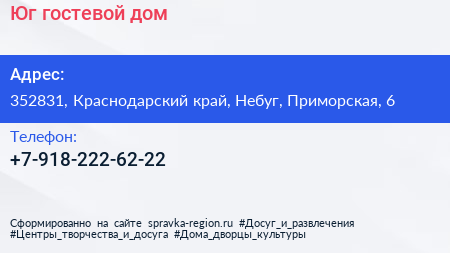 Юг, гостевой дом по адресу 352831, Краснодарский край, Небуг, Приморская, 6 в дальнейшем Организация, размещена в следующих категориях: