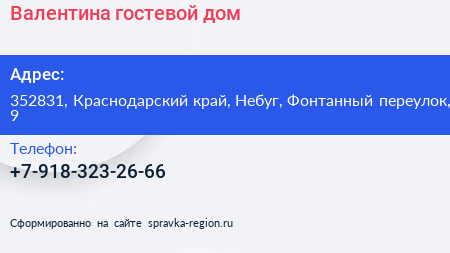 Валентина, гостевой дом по адресу 352831, Краснодарский край, Небуг, Фонтанный переулок, 9 в дальнейшем Организация, размещена в следующих категориях: