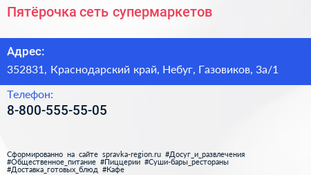 Пятёрочка, сеть супермаркетов по адресу 352831, Краснодарский край, Небуг, Газовиков, 3а/1 в дальнейшем Организация, размещена в следующих категориях: