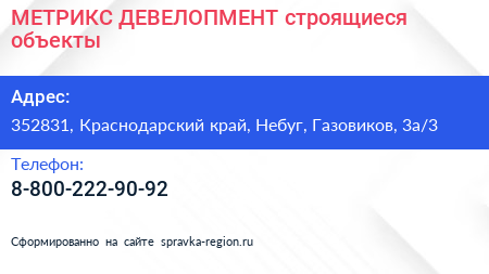 МЕТРИКС ДЕВЕЛОПМЕНТ, строящиеся объекты по адресу 352831, Краснодарский край, Небуг, Газовиков, 3а/3 в дальнейшем Организация, размещена в следующих категориях: