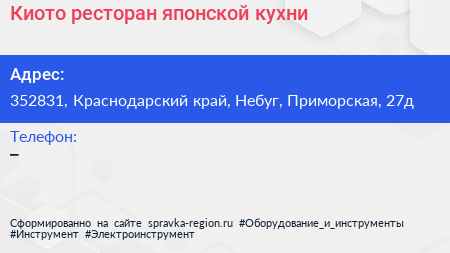 Киото, ресторан японской кухни по адресу 352831, Краснодарский край, Небуг, Приморская, 27д в дальнейшем Организация, размещена в следующих категориях: