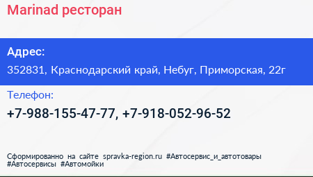 Marinad, ресторан по адресу 352831, Краснодарский край, Небуг, Приморская, 22г в дальнейшем Организация, размещена в следующих категориях: