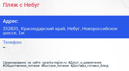 Пляж, с. Небуг по адресу 352831, Краснодарский край, Небуг, Новороссийское шоссе, 1ж в дальнейшем Организация, размещена в следующих категориях: