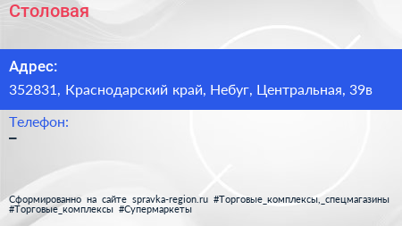 Столовая по адресу 352831, Краснодарский край, Небуг, Центральная, 39в в дальнейшем Организация, размещена в следующих категориях: