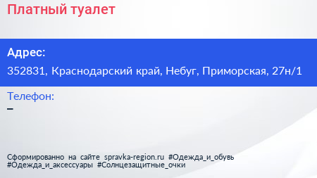 Платный туалет по адресу 352831, Краснодарский край, Небуг, Приморская, 27н/1 в дальнейшем Организация, размещена в следующих категориях: