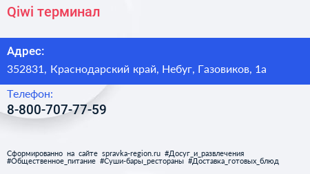 Qiwi, терминал по адресу 352831, Краснодарский край, Небуг, Газовиков, 1а в дальнейшем Организация, размещена в следующих категориях:
