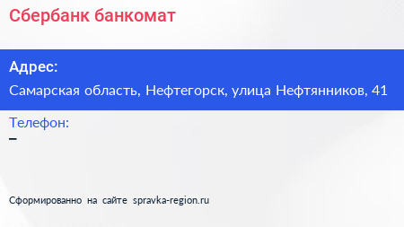 Сбербанк, банкомат по адресу Самарская область, Нефтегорск, улица Нефтянников, 41 в дальнейшем Организация, размещена в следующих категориях: