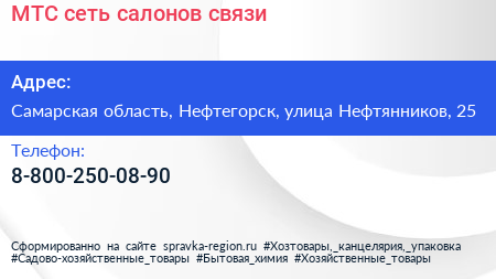 МТС, сеть салонов связи по адресу Самарская область, Нефтегорск, улица Нефтянников, 25 в дальнейшем Организация, размещена в следующих категориях: