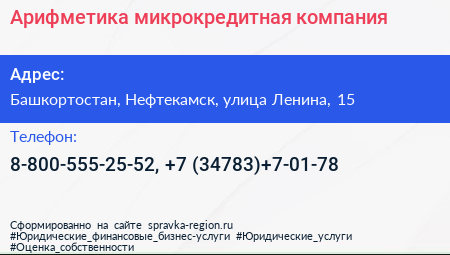 Арифметика, микрокредитная компания по адресу Башкортостан, Нефтекамск, улица Ленина, 15 в дальнейшем Организация, размещена в следующих категориях: