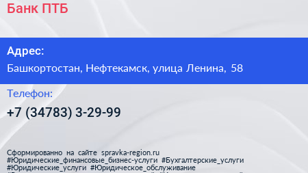 Банк ПТБ по адресу Башкортостан, Нефтекамск, улица Ленина, 58 в дальнейшем Организация, размещена в следующих категориях: