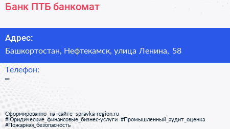 Банк ПТБ, банкомат по адресу Башкортостан, Нефтекамск, улица Ленина, 58 в дальнейшем Организация, размещена в следующих категориях: